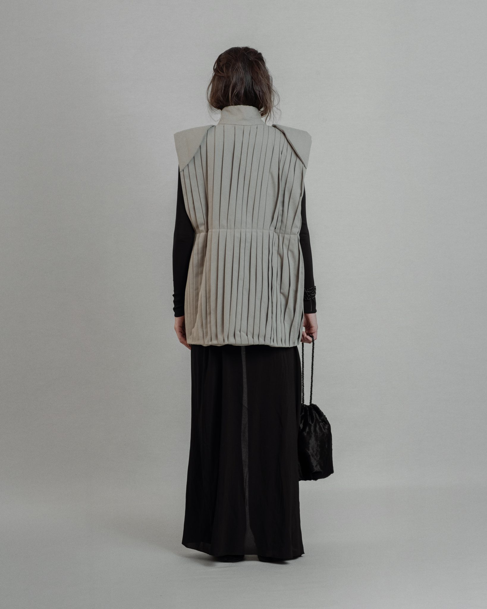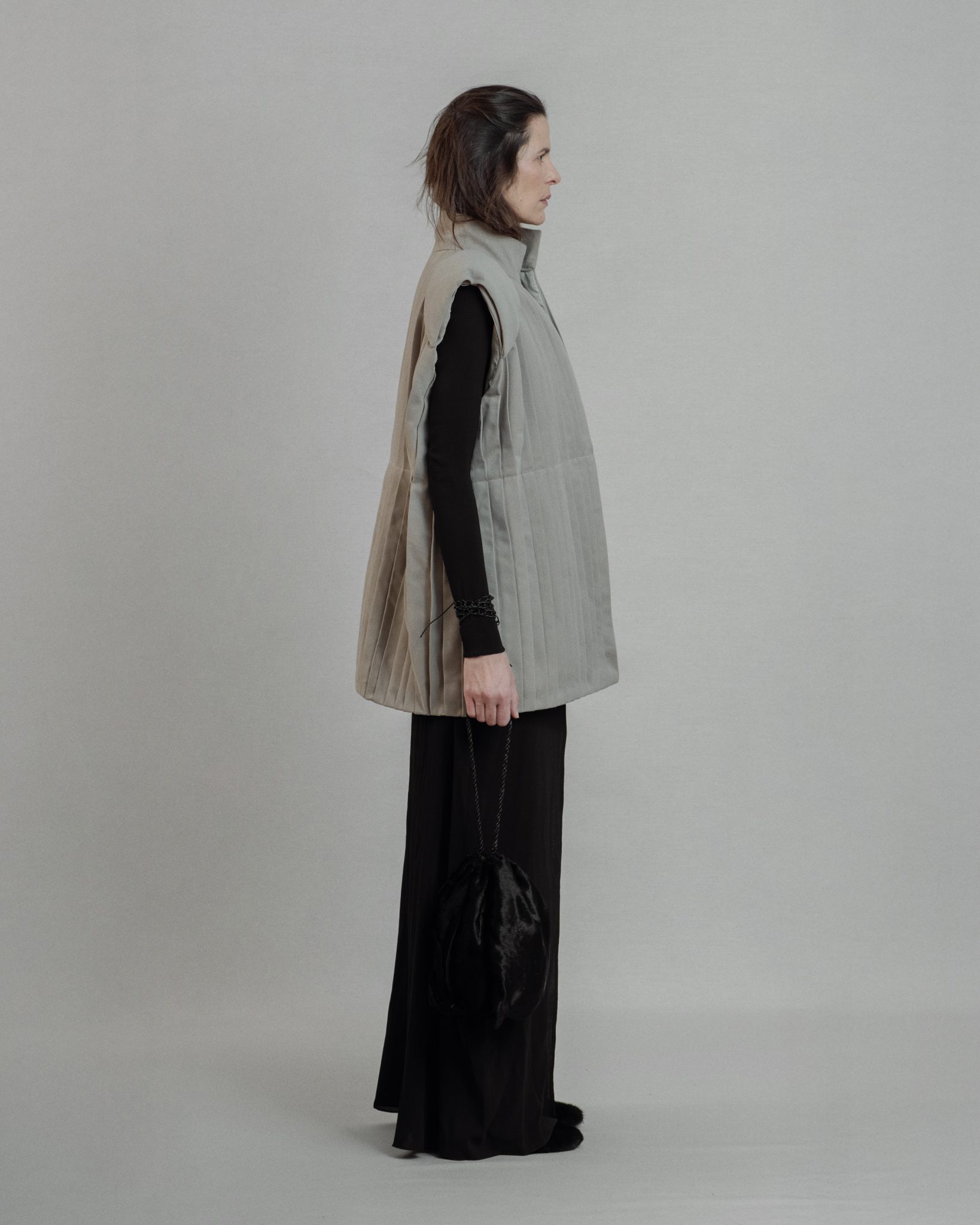 Brushed cotton vest with pleated fabric in over sized fit. Hidden pockets and padded sleeve cushion details on the shoulders. Viscose lining.
