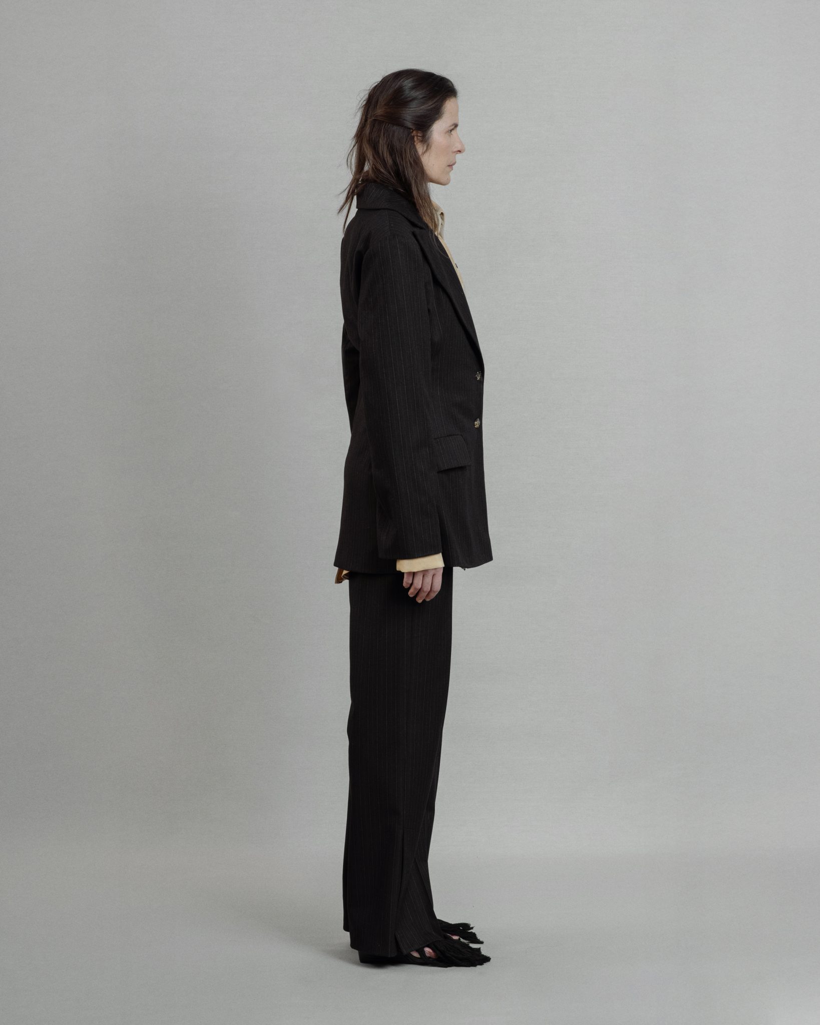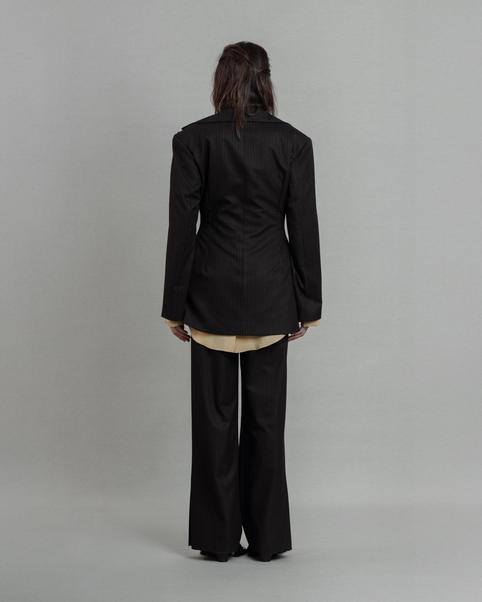 Deep brown wool and cotton blend pants with green and pink thin stripes. Fitted in the waist, straight down to the hem.