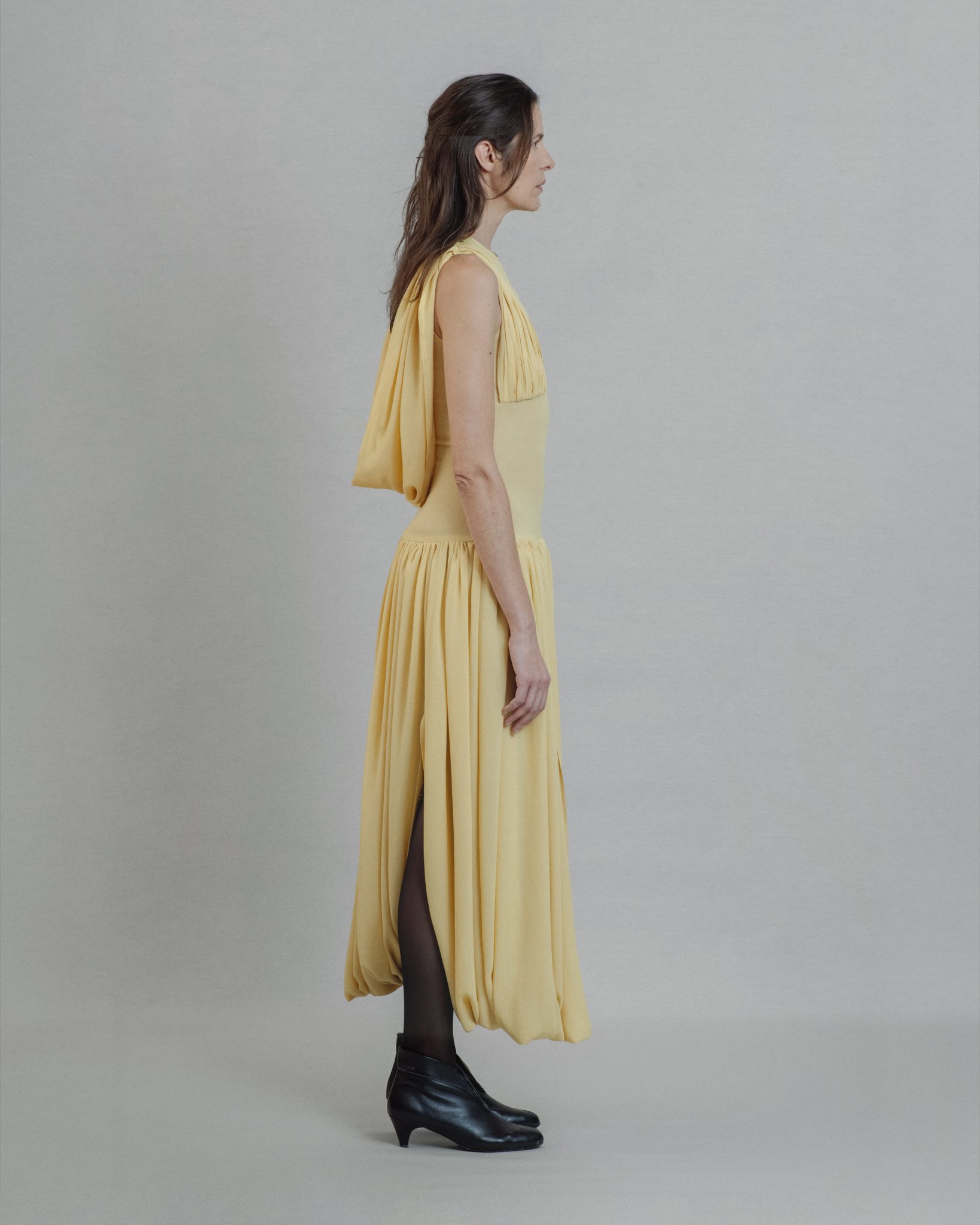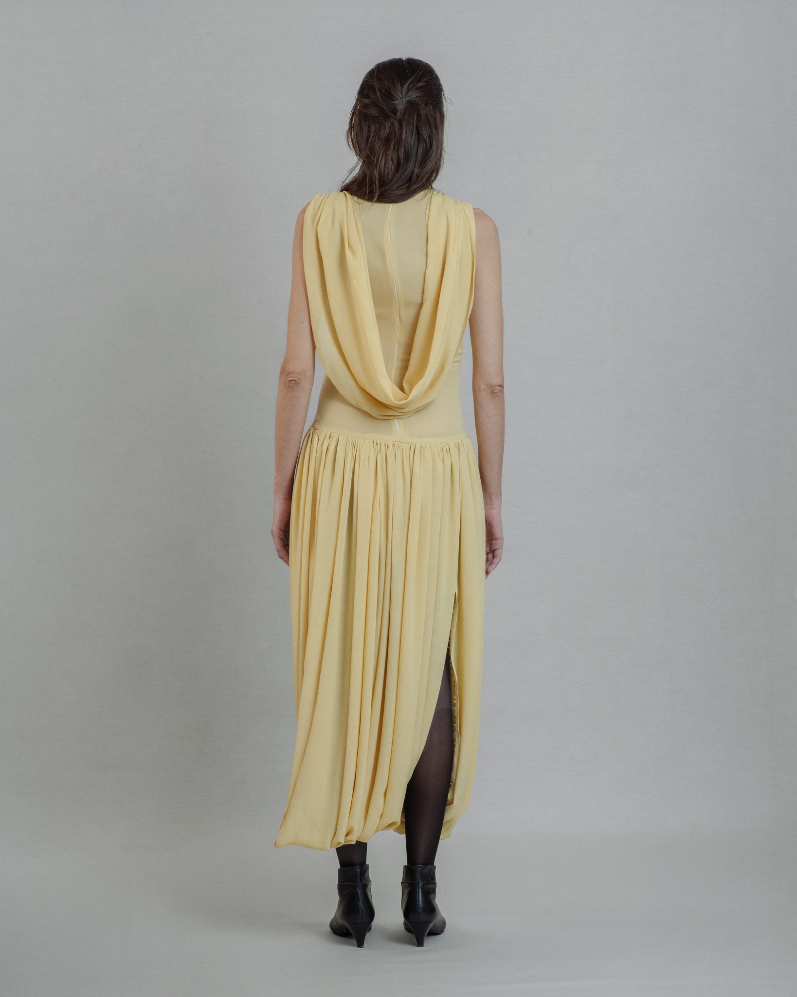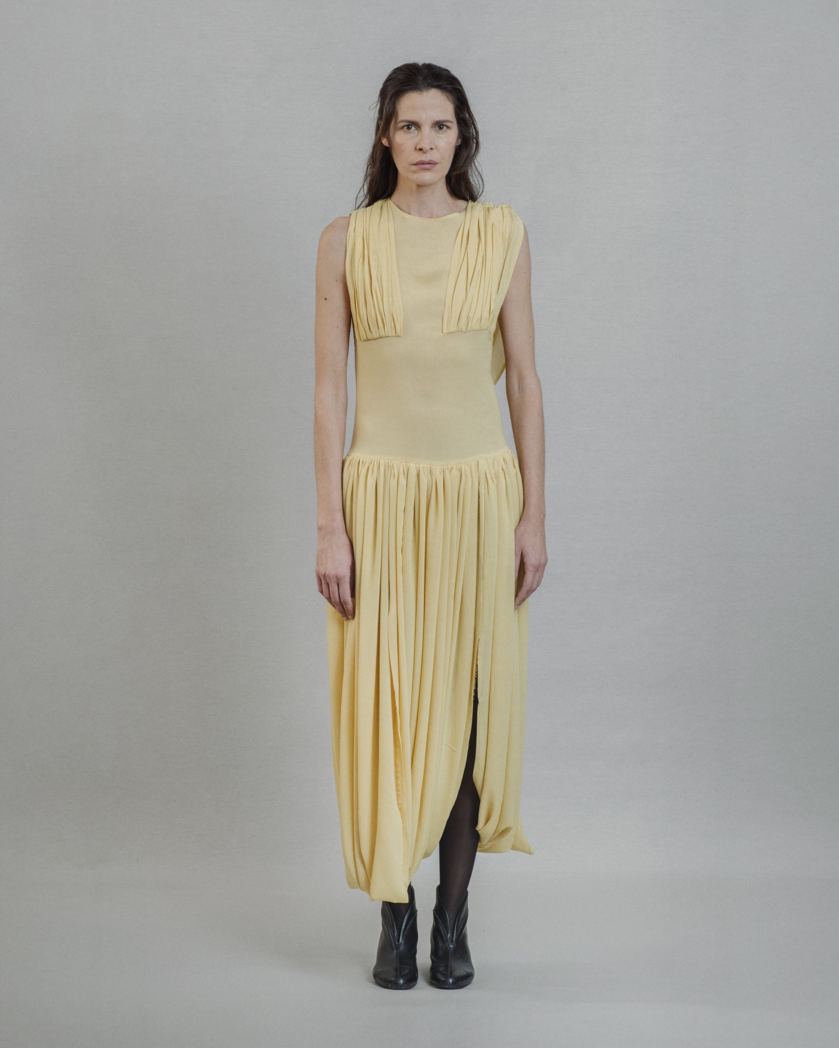 Light yellow viscose dress fitted in waist with gathered details on the bust falling to the back and slits over the legs.