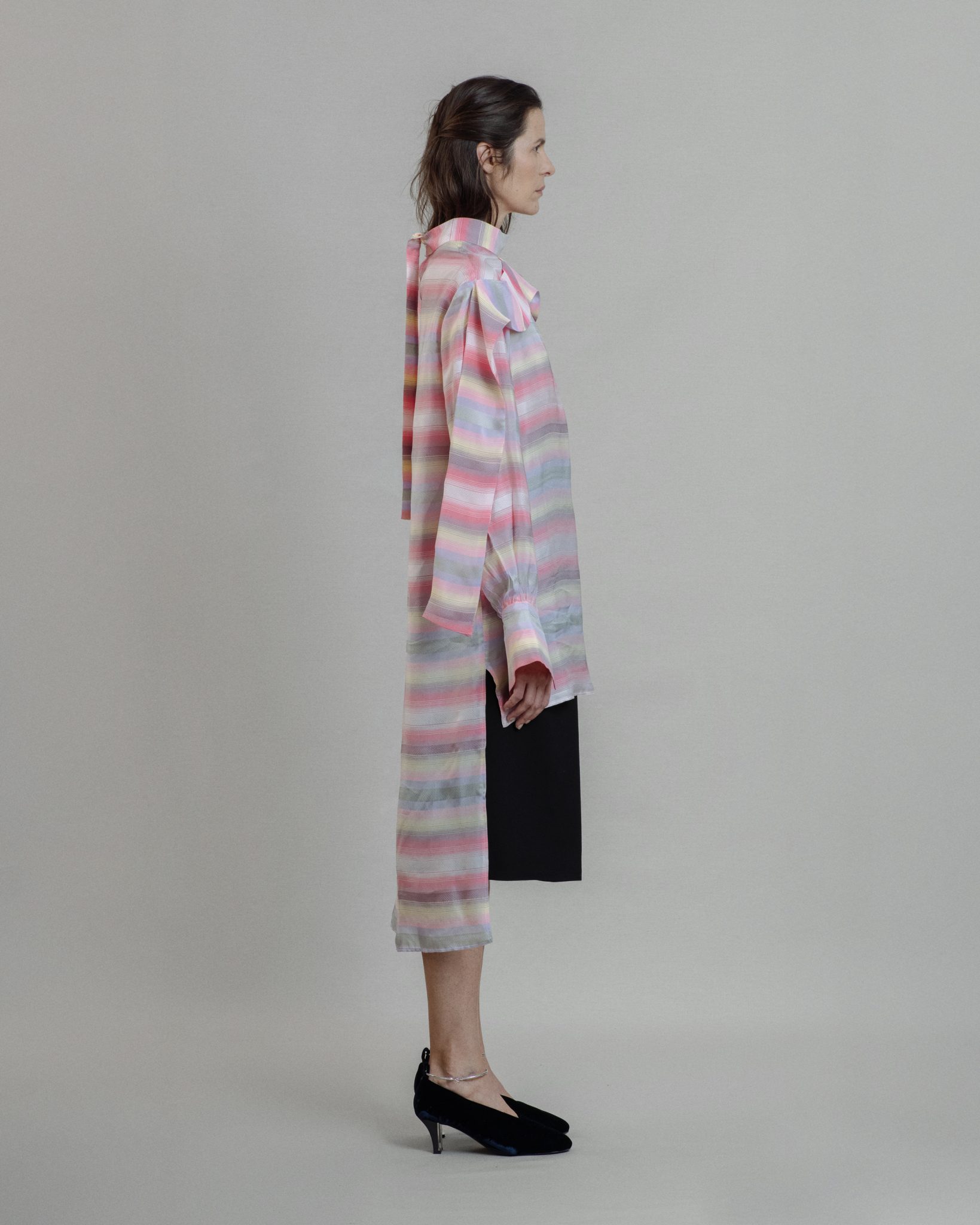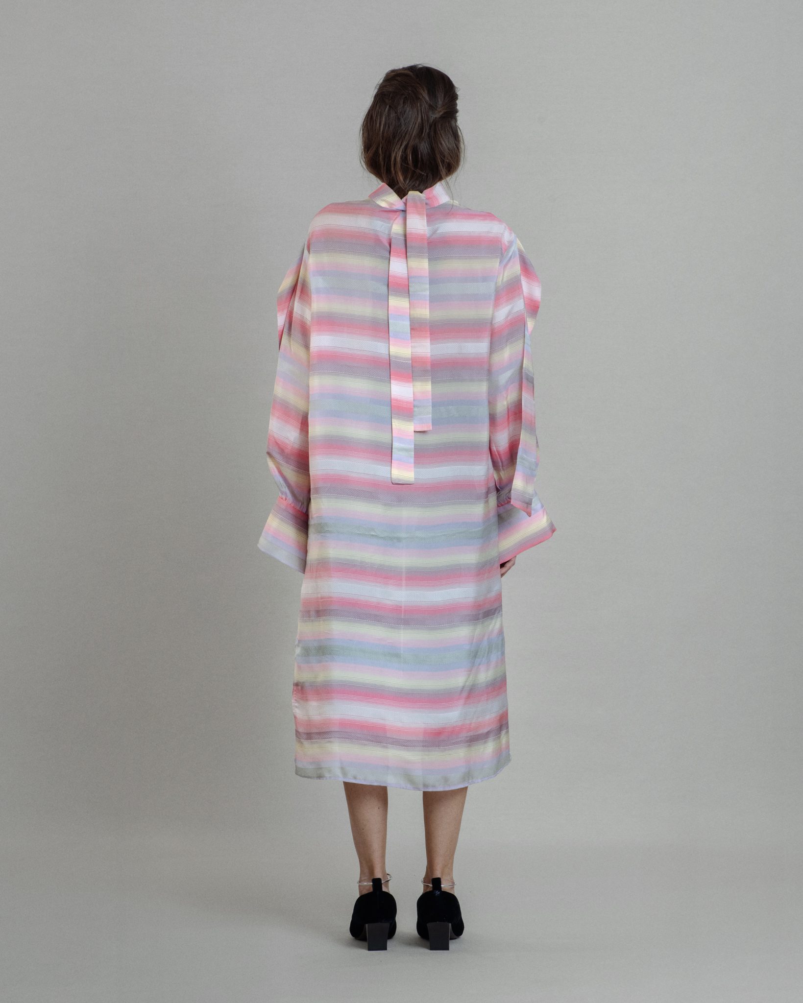 Shirt/ dress in yellow, violet and pink hues. Light viscose fabric with strap details on the front, tied around the neck.