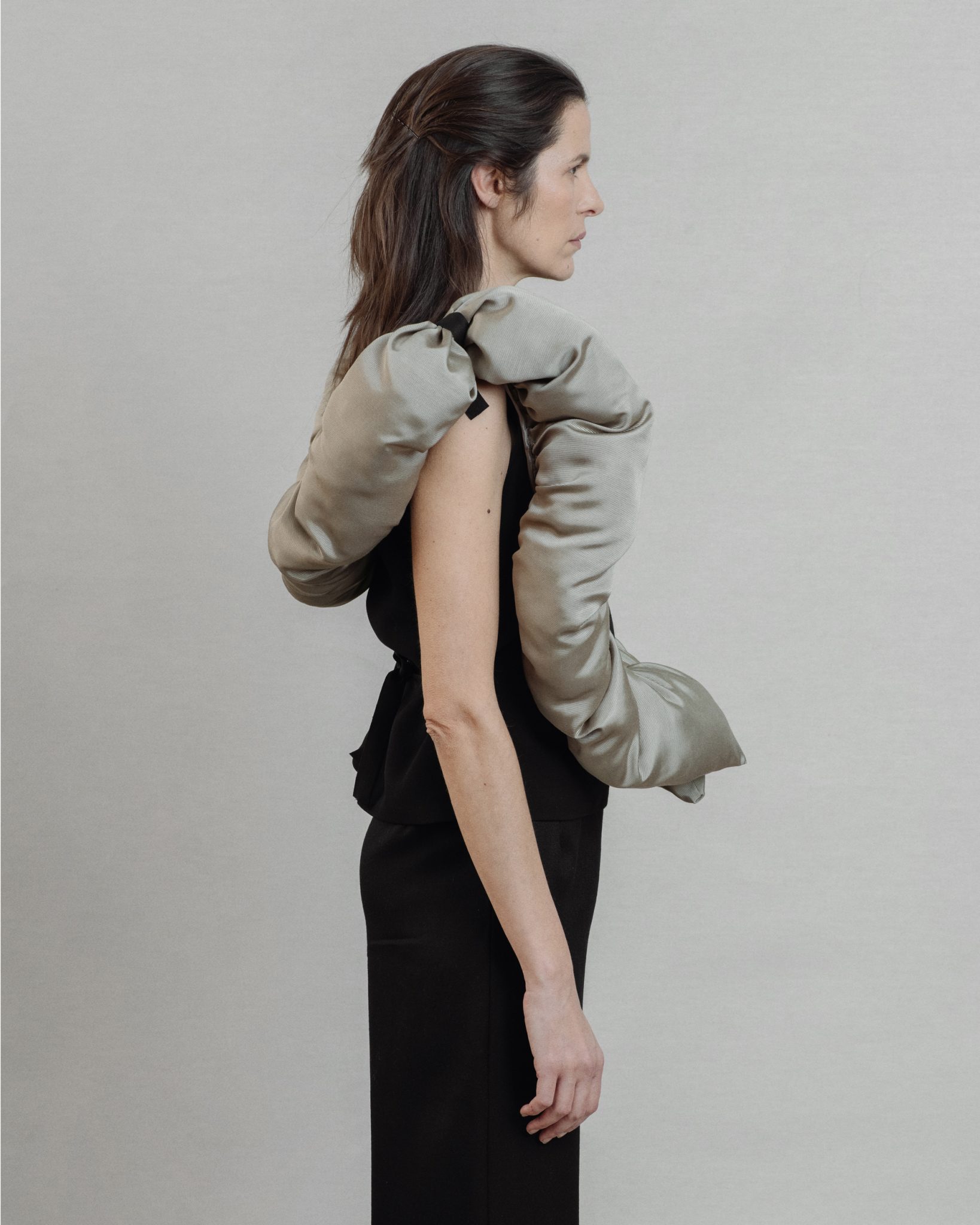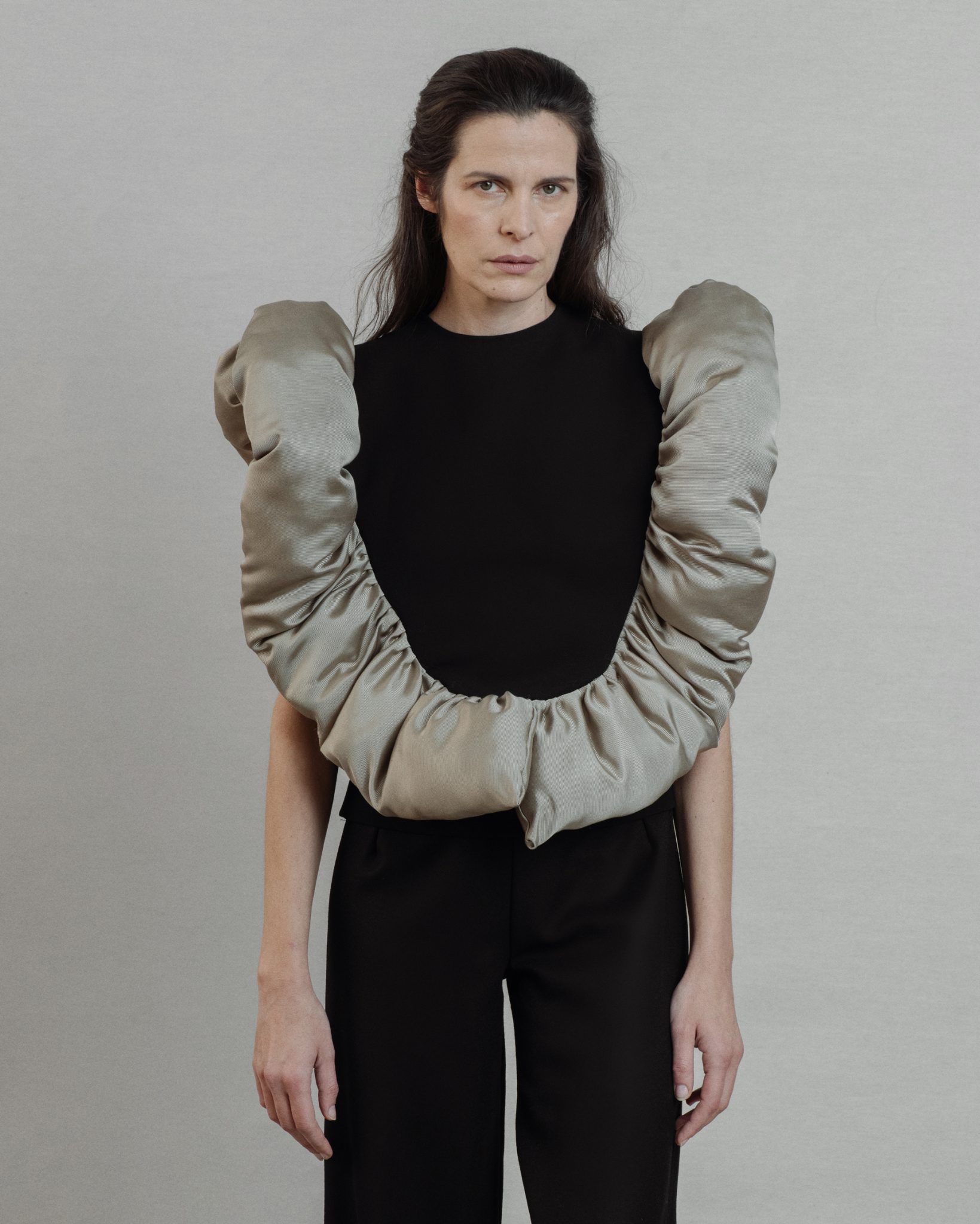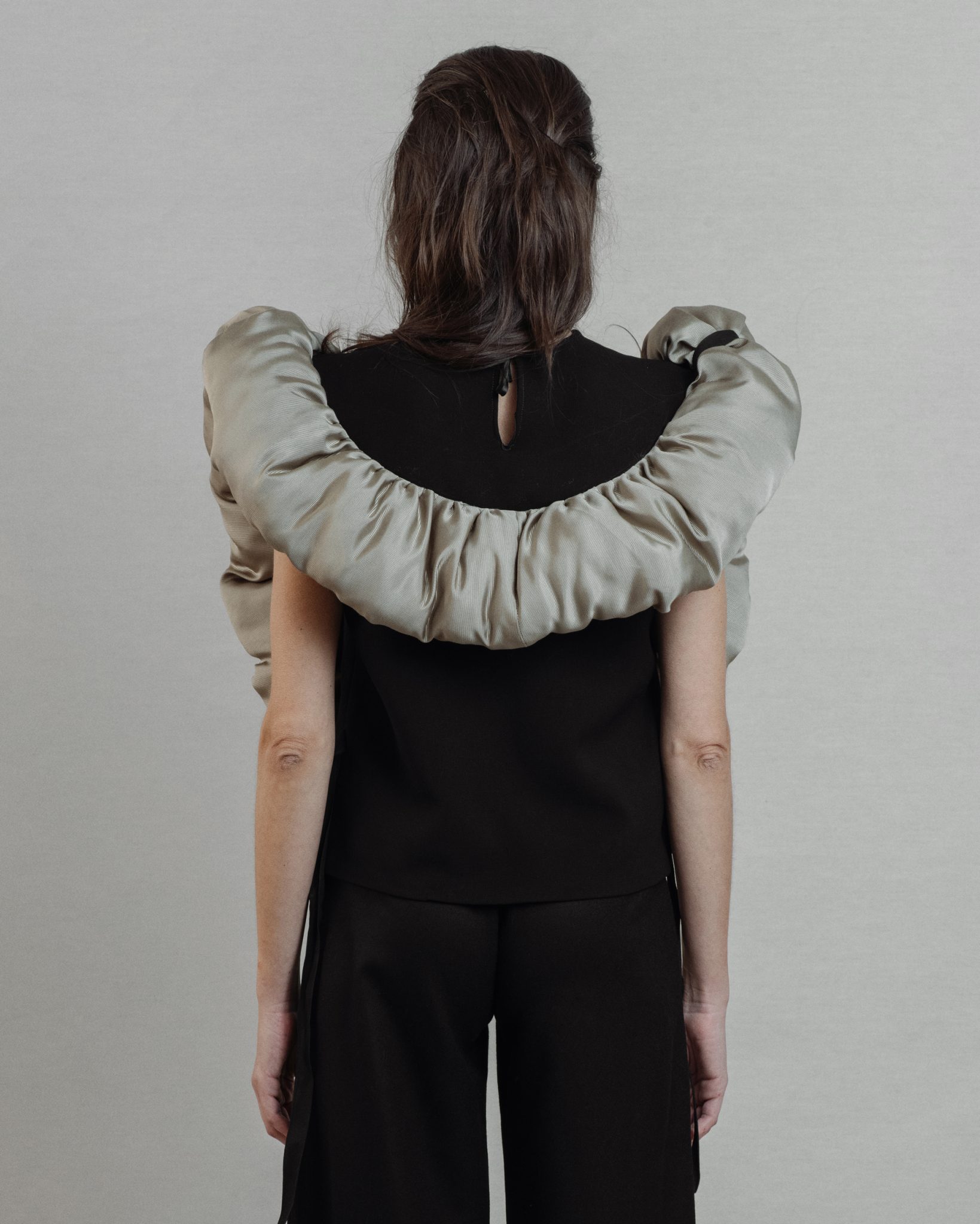 Black heavy wool top with olive green shiny gathered viscose details. Filled with wool fibres to create a puffy effect. Straps on the back to tie around the waist if wanted thus making it more fitted.