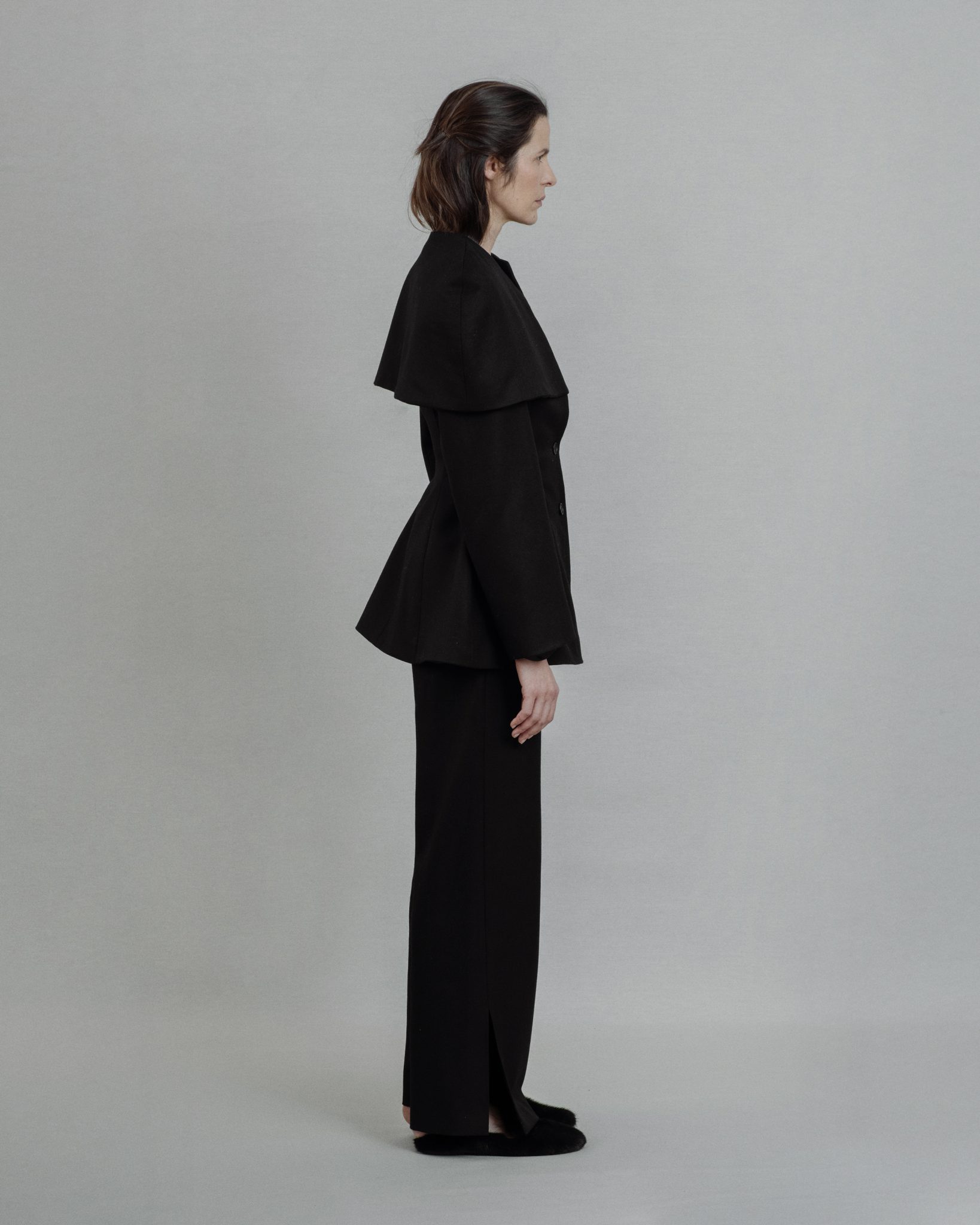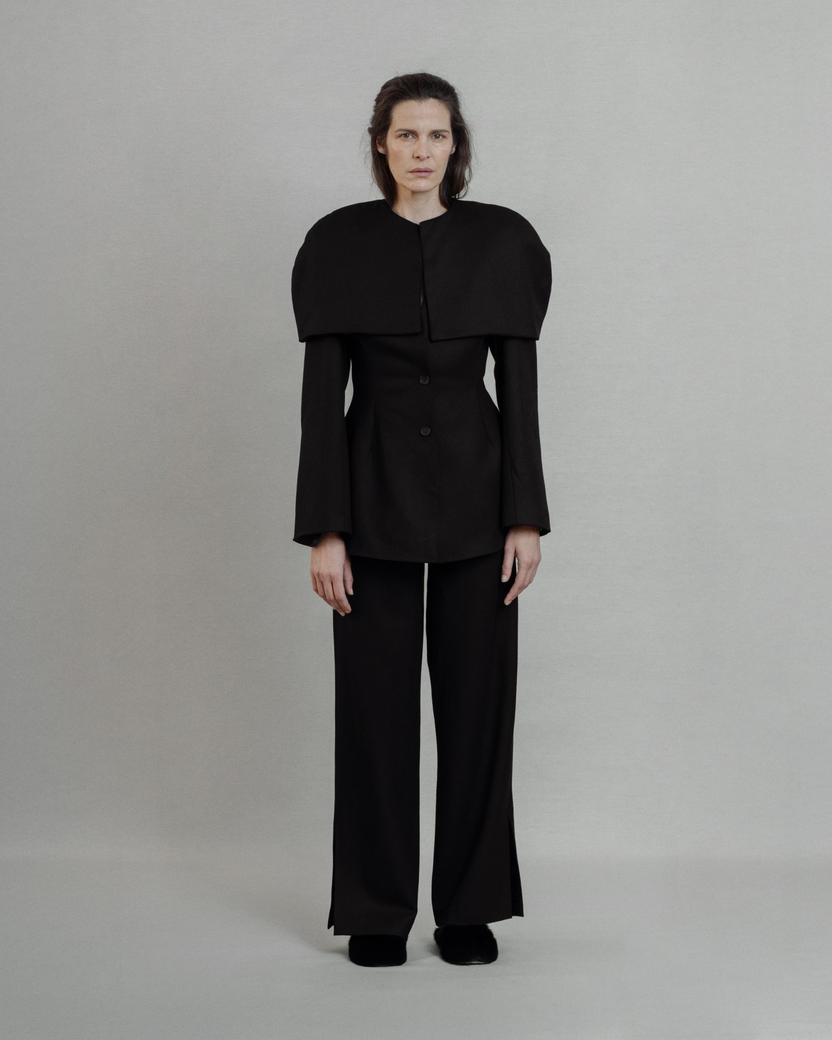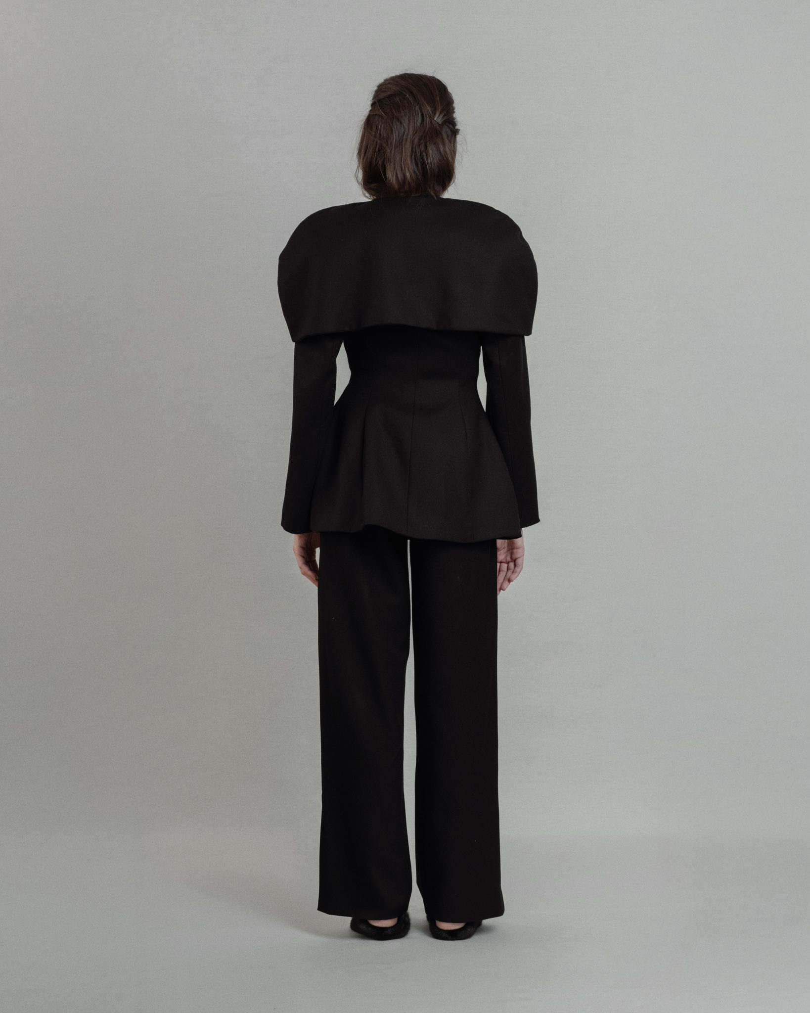Black pure wool fitted jacket with removable short cape. Accentuated hips. Viscose lining.